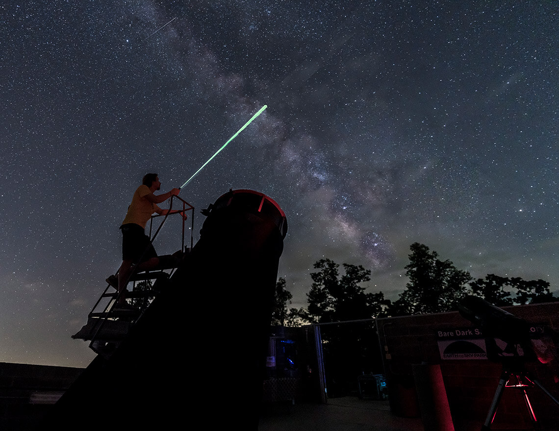 Kyle Lanning, observatory manager at the Bare Dark Sky Observatory, points a green astronomy laser at a seemingly empty spot in the night sky. The light vanishes from sight at a point dozens of feet in the air. “Can anybody see anything at the end of that laser?” he asks. He’s answered with a chorus of “no’s” from the crowd of folks who have gathered at Mayland Community College’s Earth to Sky Park for one of the observatory’s regularly scheduled stargazing events. “I’ve got about 100,000 stars pulled up in the scope in that spot,” he says. Climbing a stepladder to reach the eyepiece of the gigantic Dobsonion-style Newtonian telescope, observers are amazed to see countless twinkling stars — some tiny specs, others giant balls — where the naked eye saw nothing.