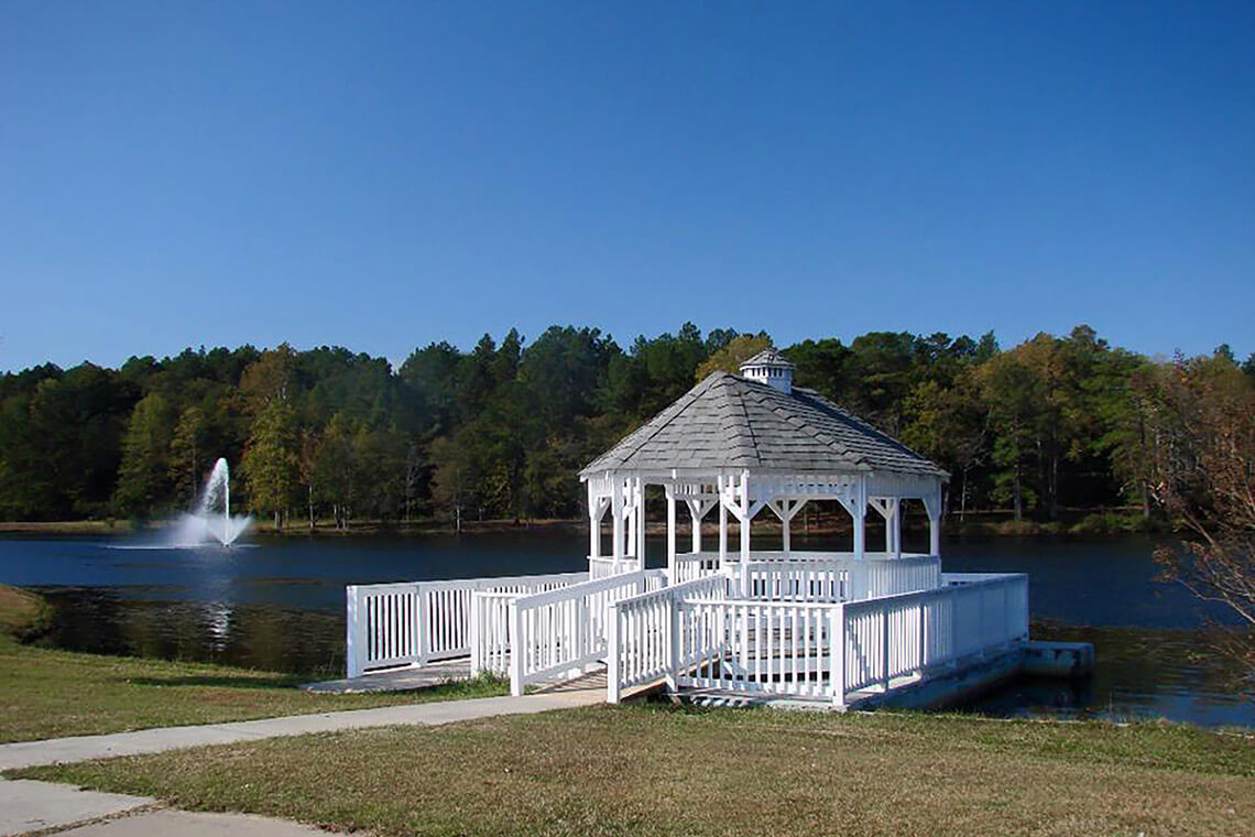 The gazebo at Aberdeen Lake Park offers a place to rest with a quiet waterside view. Photography courtesy of Visit Pinehurst, Southern Pines, Aberdeen