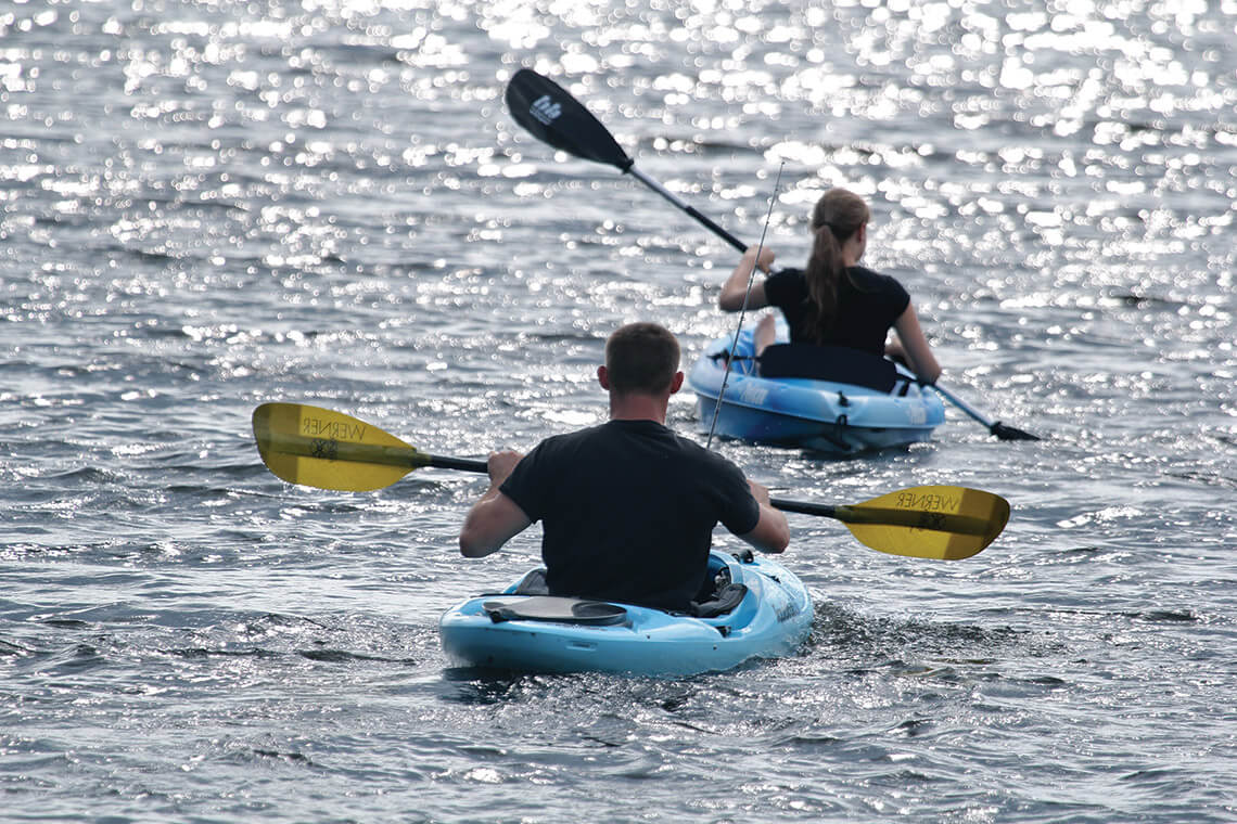 You can walk the loop trail around the lake or explore the peaceful waters by boat. Motorized craft aren’t allowed, so the calm, no-wake shoreline is approachable for all skill levels. To drift, fish, or paddle at your leisure, rent a kayak or paddleboard for the day from the WakeRack locker.