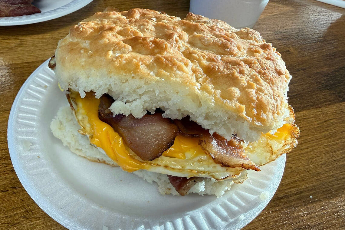 Before taking to the trails, stop by Robbins Cafe for a buttery biscuit with bacon, egg, and cheese. Photography courtesy of Visit Pinehurst, Southern Pines, Aberdeen