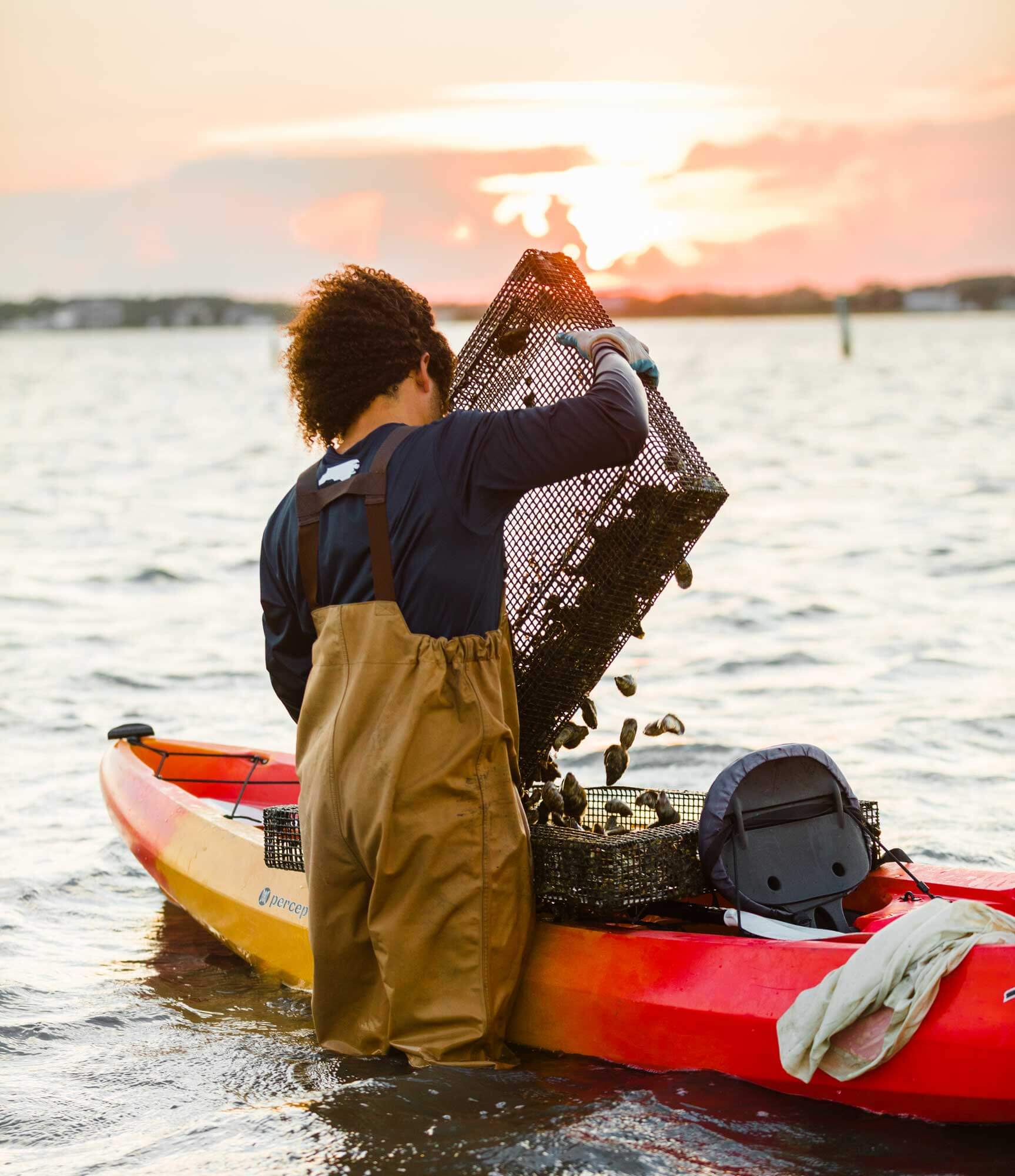 And yet, Bethea has decided to up the degree of difficulty. He refuses to use a motor-powered boat to reach his farm, instead relying on his kayak. He doesn’t have a davit — or any other mechanical contraption — to lift from the water the hefty cages that hold his oysters; all he has are his arms. Bethea even frowns on plastic, preferring to collect his mollusks in a pillowcase. “We try to do it 100 percent all-craft,” he says.