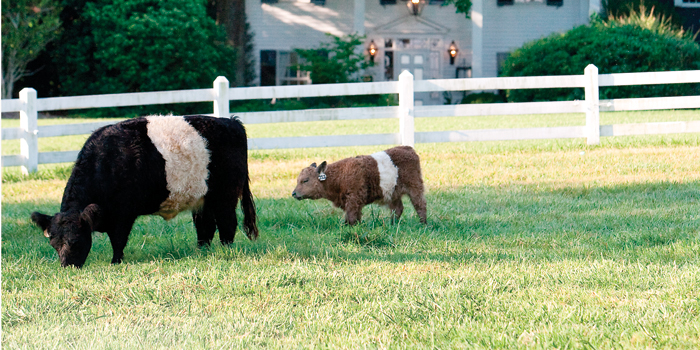 Belted Galloway cattle wander the grounds at Fearrington Village. photograph by Stacey Haines