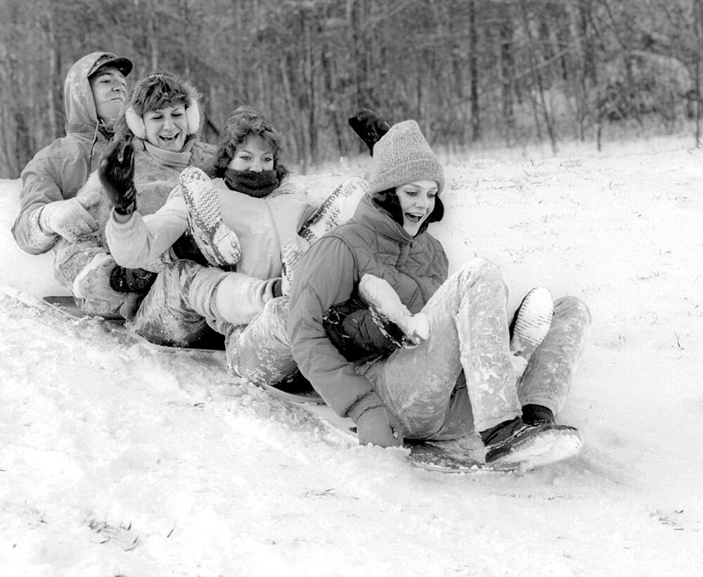 You waited for a fresh blanket of snow. A full moon was a bonus: It helped to see your feet as you climbed to the top of Suicide Hill or Stadium Hill or the tiered, rolling lawn in front of Justice Hall. Eyes squeezed shut, you took a running start, hopped onto the tray, and let the powder and incline do the rest. You didn’t hold on for dear life, because there was nothing to hold on to. It was a singular moment of joy, the kind that can only be found in those four years between childhood and adulthood.