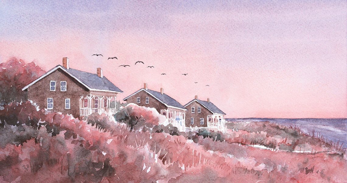 On this barrier island, near the jut toward Frying Pan Shoals, far from the lighthouse, from the market and the marina, from the spa and salon, from the golf carts and the pitchers of margaritas on tables beneath umbrellas strung with lights, three simple wooden houses, each built between 1903 and 1933, stand in a row on a dune thick with vegetation.