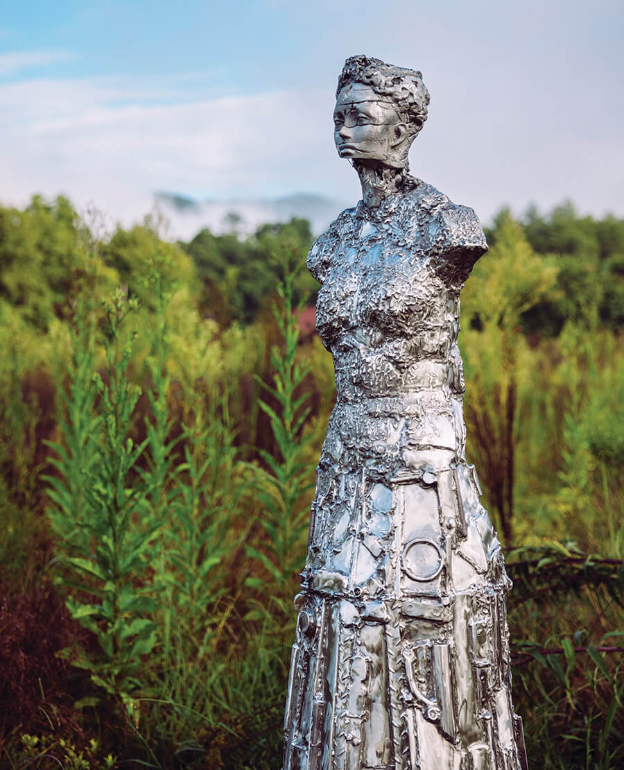 Seven years later, Bigley, dressed like a blade of grass in brown shoes, tan jeans, and an olive-green blazer, stands at the edge of the field, waving his arm across the expansive landscape. It’s now dotted with rusting towers of steel. Wiry, skeletal structures. Roses and mermaids made from metal. A pillar of pots and pans. A whirligig. A Victorian-looking woman with a futuristic face. Bigley has transformed this natural setting into the Western North Carolina Sculpture Center and Park — about 12 acres of land that include his field of sculptural dreams, a half-mile sculpture trail, a 10,000-square-foot workspace, and a total of nearly 100 pieces by artists from North Carolina to Canada and Puerto Rico.