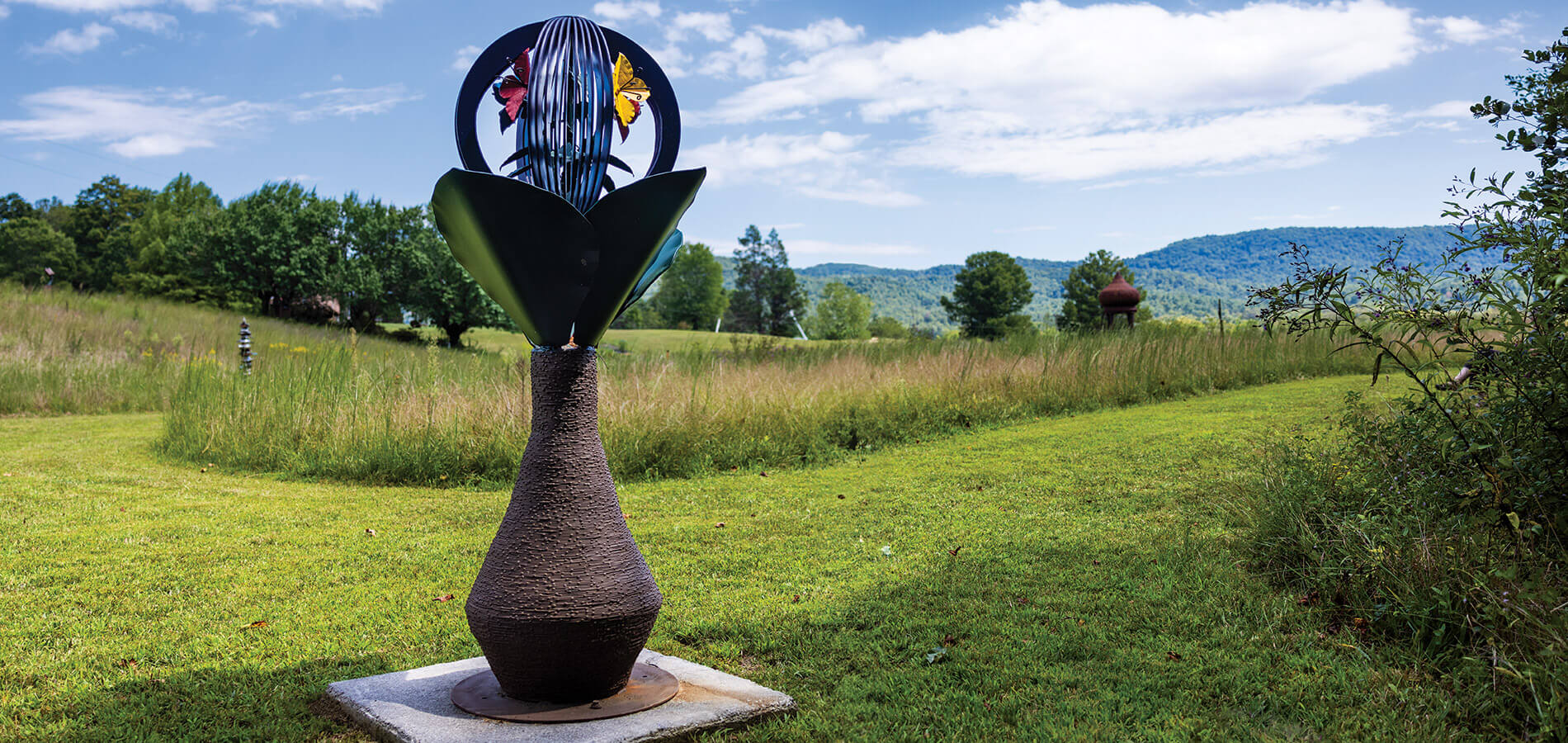 “To work with this backdrop is so ideal,” Bigley says. A graduate of Appalachian State University and Alfred University, he taught art at Spellman College in Atlanta before returning to North Carolina to realize his vision. Now, he’s back at App State, teaching and bringing together artists and art lovers alike in this rural environment that’s better known for big barns and oversize tractors than for sculptures of giant fingers with painted nails. As he walks along the park’s upper ridge, he gazes across terrain so vast that many of the sculptures appear tiny against the mountains and sky. “It’s amazing how even a 10- or 12-foot piece gets kind of swallowed up in this landscape,” he says. “My hope is to get a few 20- or 30-foot works out here in the next couple years.”