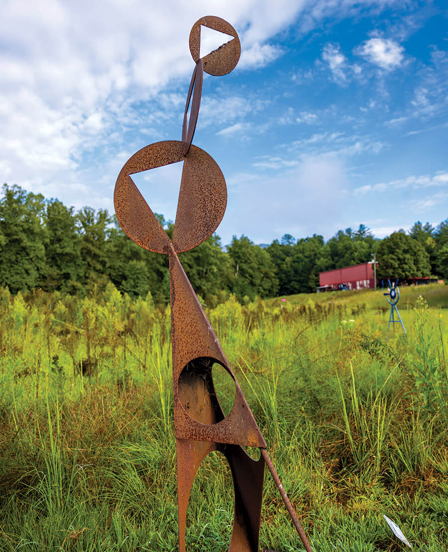 Bigley steps gingerly through the field and stops at a mass of red steel shaped like a rose. It sits atop a twisted stem of metal. On a placard below the piece, called Bloomin, is the name Karena “Kidd” Graves, who, Bigley says, “is a younger artist who was just at Arrowmont, a school of arts and crafts in Tennessee.” Part of the WNC Sculpture Center’s partnership with the Caldwell County Arts Council involves inviting young artists like Graves, who participated in Sculpture Celebration, to submit their works for consideration at the sculpture center. “After the Celebration,” Bigley says, “we bring some of those pieces here to showcase them.”