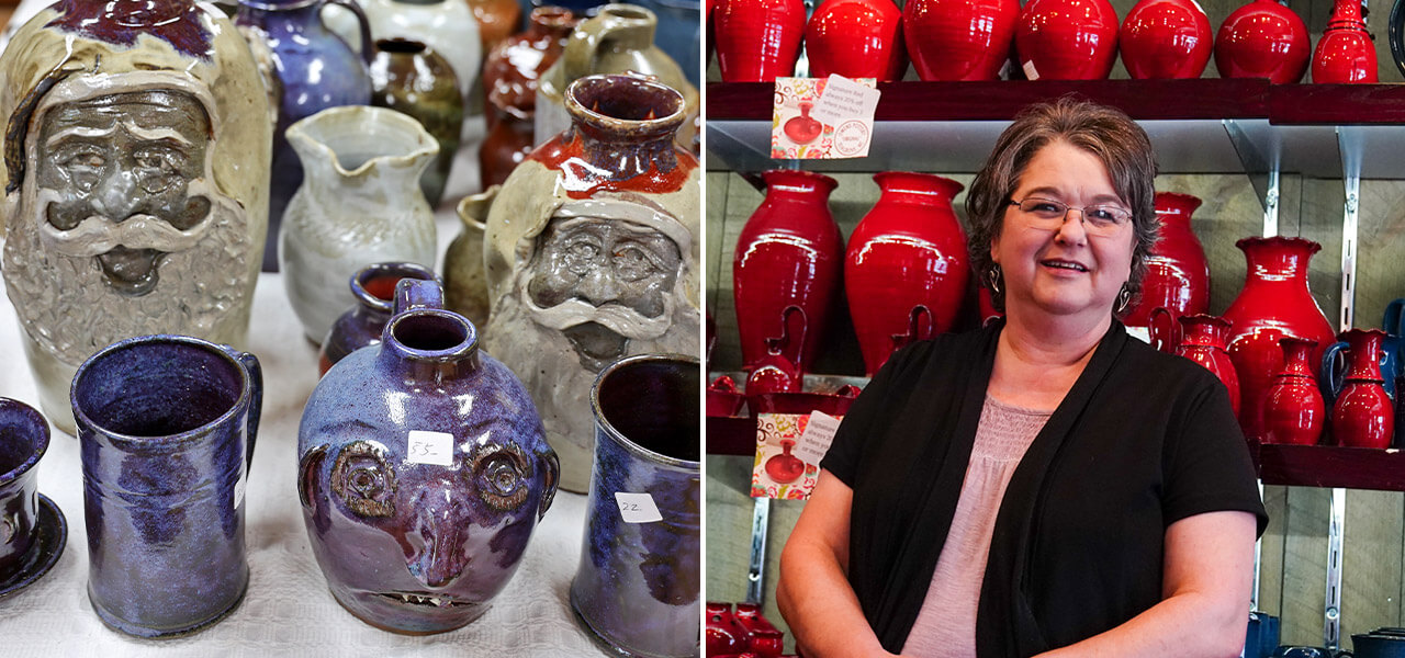 From their Bolick and Traditions Pottery shop on Main Street, Michael and Janet Calhoun can tell you about five generations of potters throwing clay before them. “In the late 1800s, the Owens were making pickling crocks and canning jars and that type of thing — utilitarian pottery,” Janet says. They were Seagrove potters.