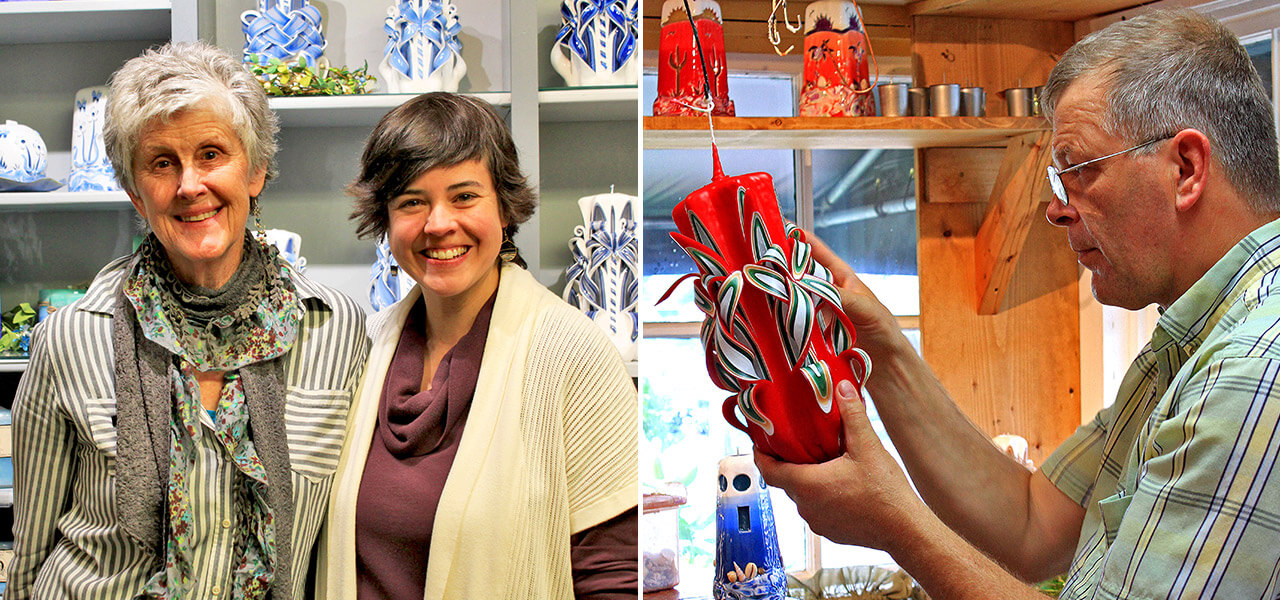 People usually have one of two reactions when they come into Larry and Cyndi Ziegler’s candle store and see their collection of hand-carved candles. “They’ll either say, ‘Oh my gosh, my grandmother used to have one of these!’ and it’s like a walk back in history, or, ‘Oh my gosh, is that wax? Is that a candle? No, it’s not!’” Cyndi says. “Whether they’ve never seen one before and are totally amazed or they remember it from when they were a kid, a lot of times they buy one and have a happy memory.”