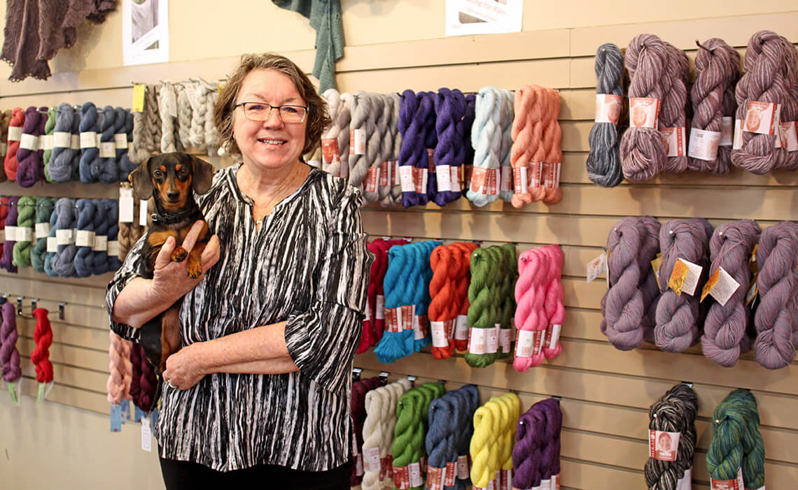 Colleen Taber’s shop mascot, a miniature dachshund named Lizabeth, gives free snuggles to visitors looking for unique and high-quality brands of yarn. “If you sit in one of our comfy chairs, she will most likely jump in your lap,” Taber says.