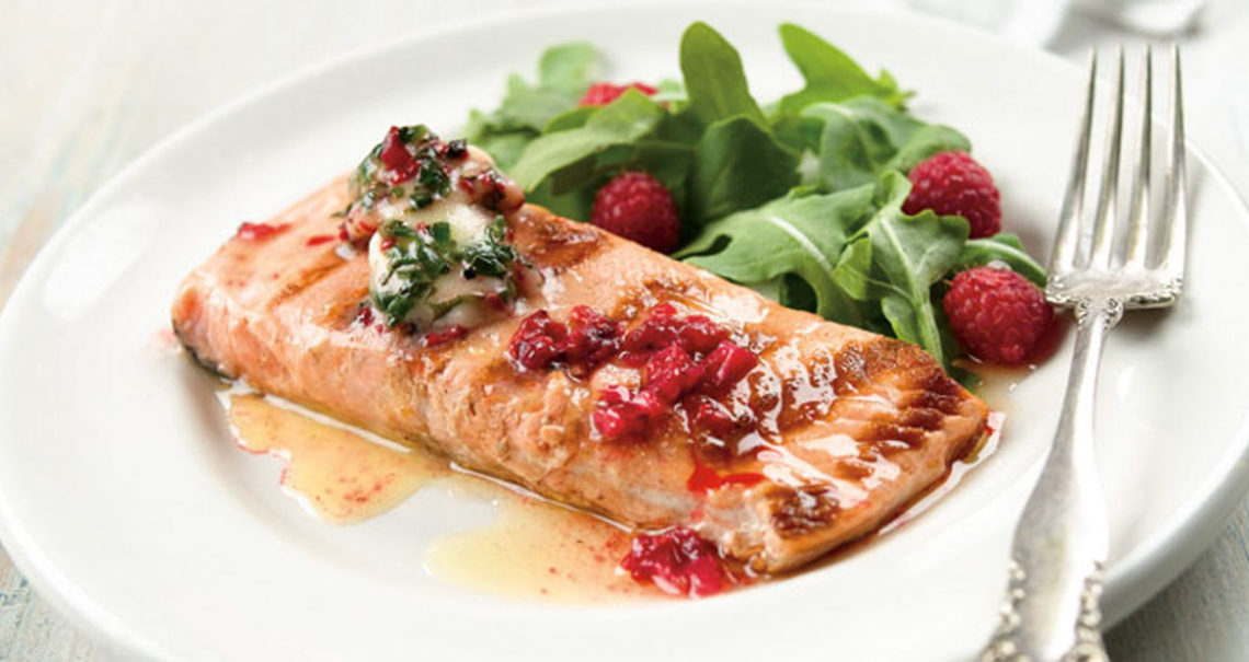 In a small bowl, blend butter, crushed raspberries, minced arugula, salt, and pepper with a fork. Refrigerate butter mixture. Whisk together olive oil, crushed raspberries, raspberry vinegar, shallot, salt, and pepper. Set aside vinaigrette mixture. Grill salmon over medium-high heat for 3 to 4 minutes on each side. Place 2 pats of reserved butter mixture on each fillet and allow to melt over fish. Whisk vinaigrette to recombine, and drizzle over salmon. Garnish with mound of arugula leaves and raspberries.