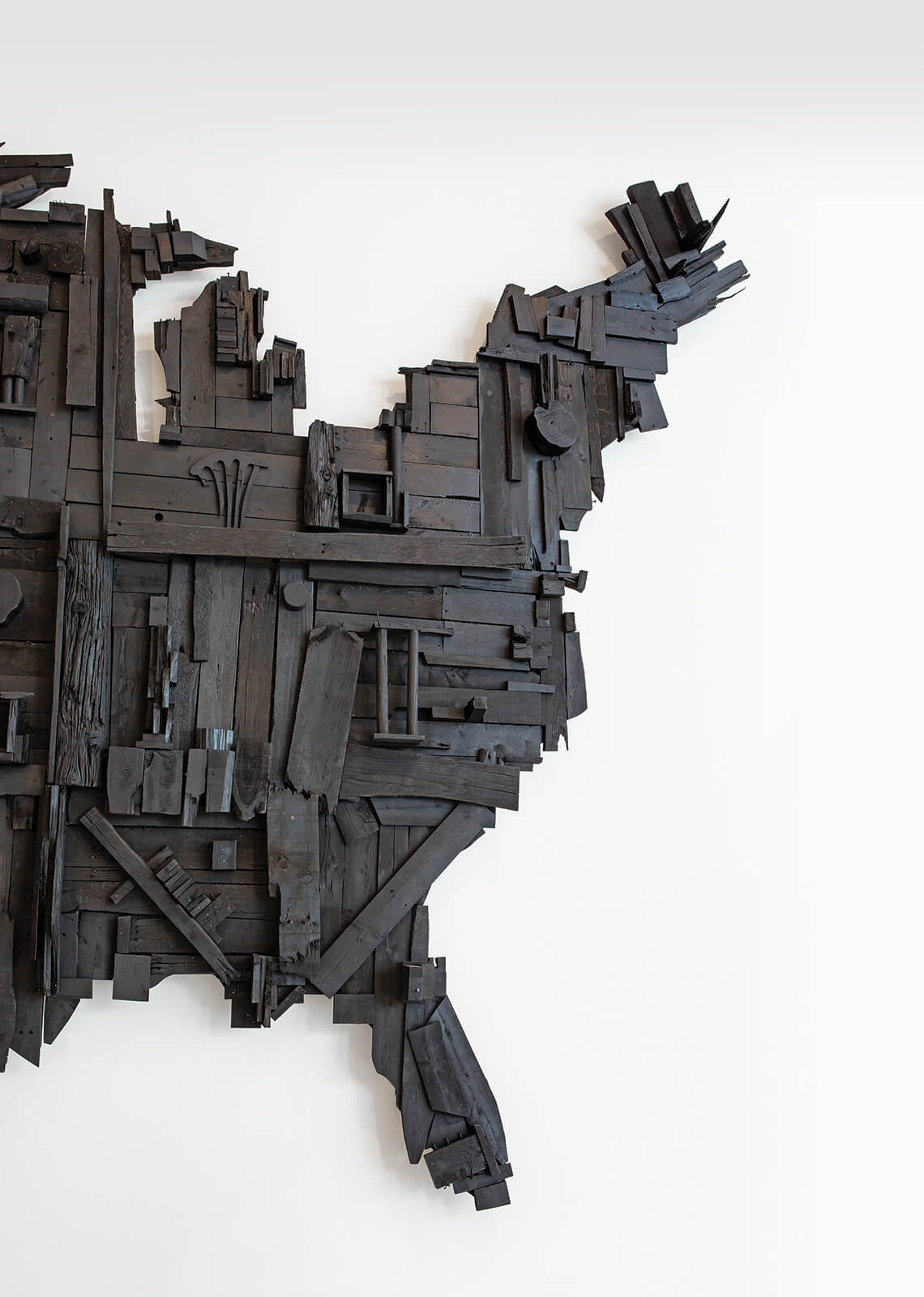 My Big Black America — a wall-size piece made by staining and spray-painting new and old woods to suggest centuries of toil — is artist Wesley Clark’s tribute to the election of America’s first Black president, Barack Obama. photograph by Sterling Stevens