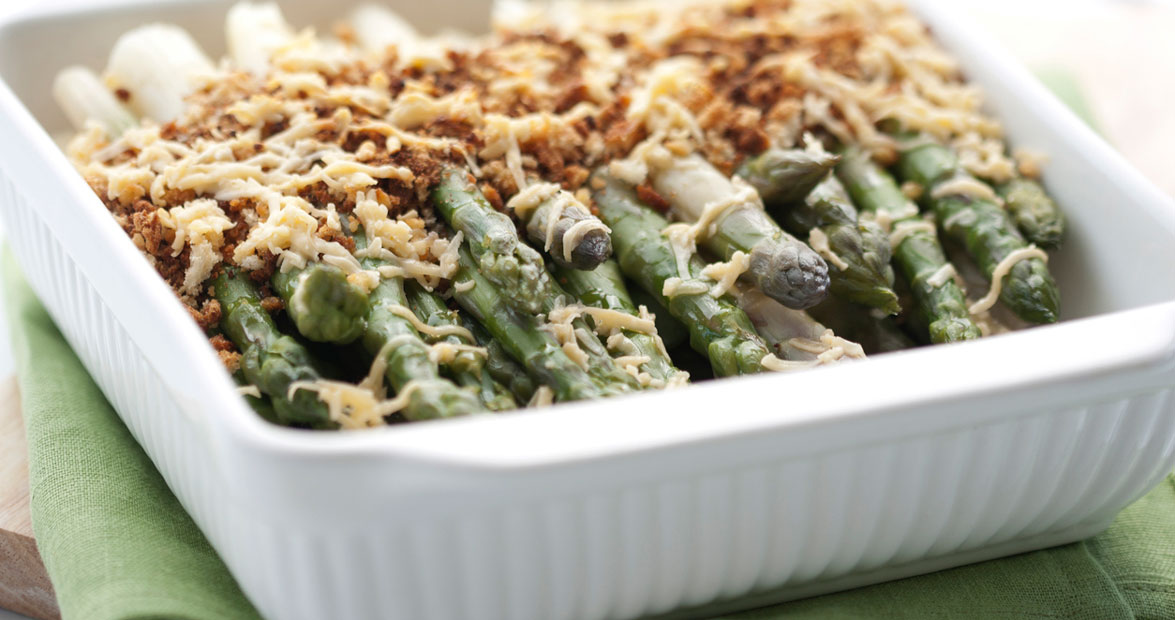 Steam asparagus until tender. Drain well, reserving liquid. Measure liquid, and add enough milk to make 1½ cups. Place half of the breadcrumbs evenly in the bottom of a buttered casserole dish.
