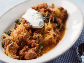 Twirl spaghetti squash “pasta” in a meaty, savory ragù for a hearty and warming gluten-free dinner.