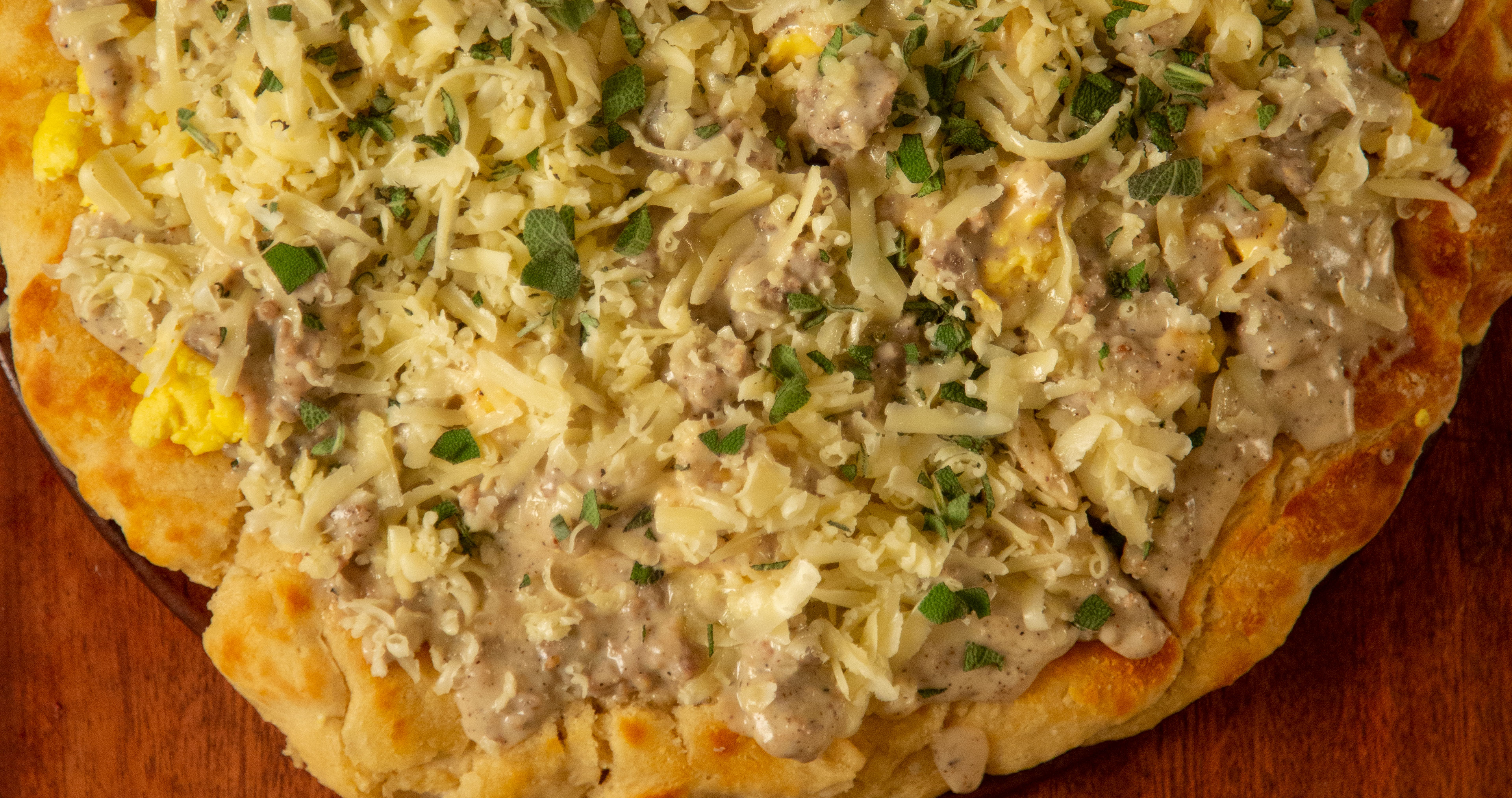 A buttery biscuit crust topped with sausage gravy, scrambled eggs, and Cheddar cheese.