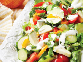 This crunchy salad is topped with fresh basil and a creamy goat cheese dressing.