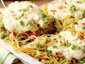 This flavorful spaghetti is topped with melted ricotta and toasted pine nuts.