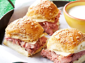 Need to fuel up before kickoff? Try these sliders stacked with roast beef and provolone — plus horseradish sauce for dipping.
