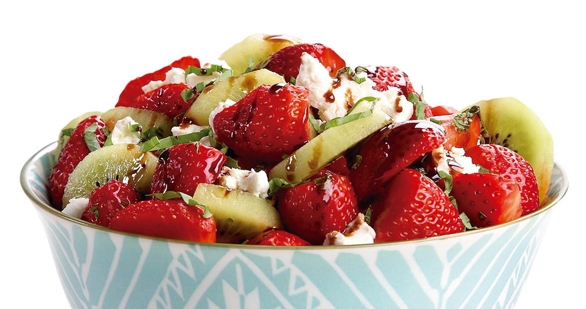 Juicy strawberries and bright kiwis meet creamy goat cheese and rich balsamic glaze for a sweet-and-savory treat.