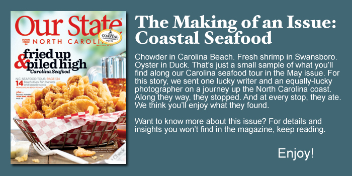 Chowder in Carolina Beach. Fresh shrimp in Swansboro. Oyster in Duck. That’s just a small sample of what you’ll find along our Carolina seafood tour in the May issue. Enjoy!
