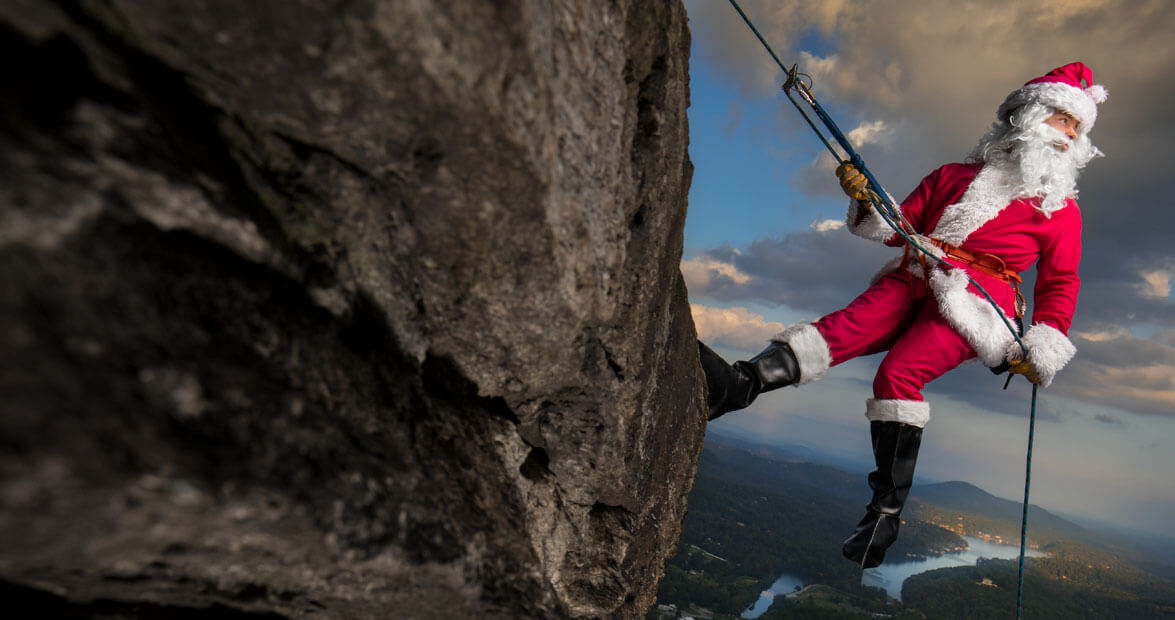 Travis Weil doesn't need a sleigh — this Santa uses ropes and a harness to rappel down Chimney Rock.
