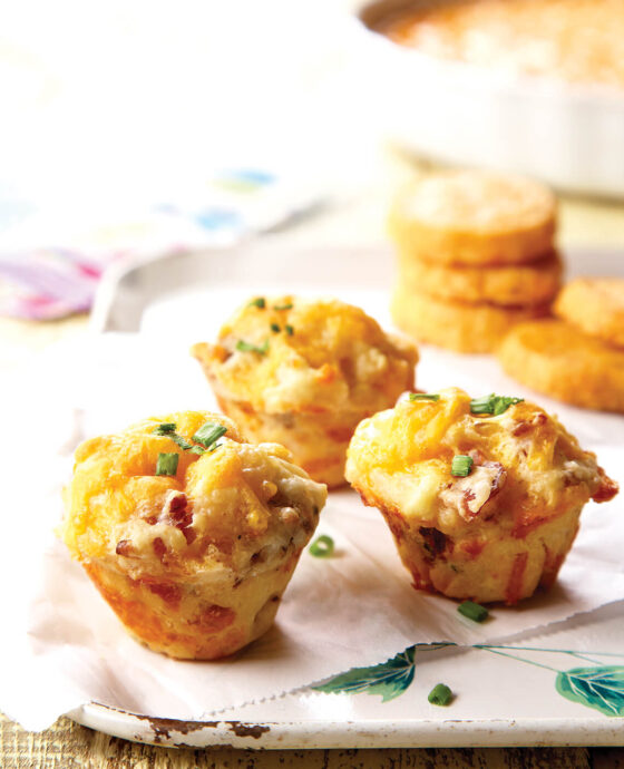 Preheat oven to 400°. Grease a 24-cup and a 12-cup mini muffin pan. In a bowl, whisk together flour, baking powder, salt, pepper, and onion powder. Add 1 cup cheese and stir.
