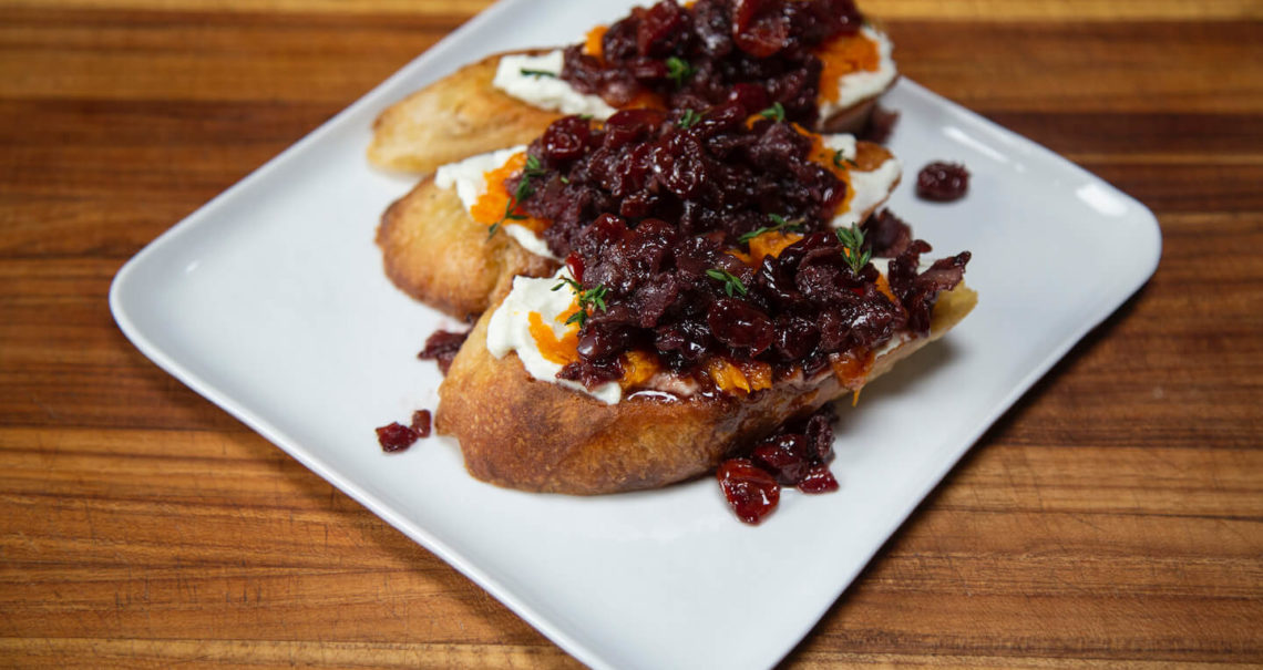 Spread a portion of the ricotta cheese onto the bread, then a spoonful of the butternut squash. Top with the bacon-cherry compote. Sprinkle with thyme.