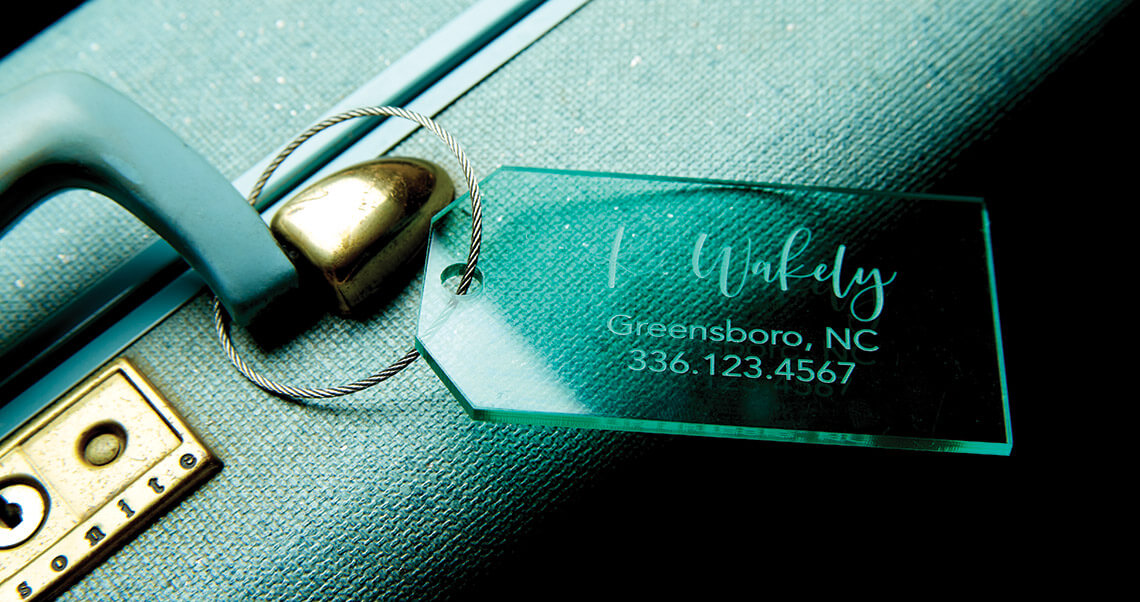 Colontonio added laser-engraved luggage tags to her inventory after designing this four-inch, transparent green one for her mother three years ago. photograph by Matt Hulsman