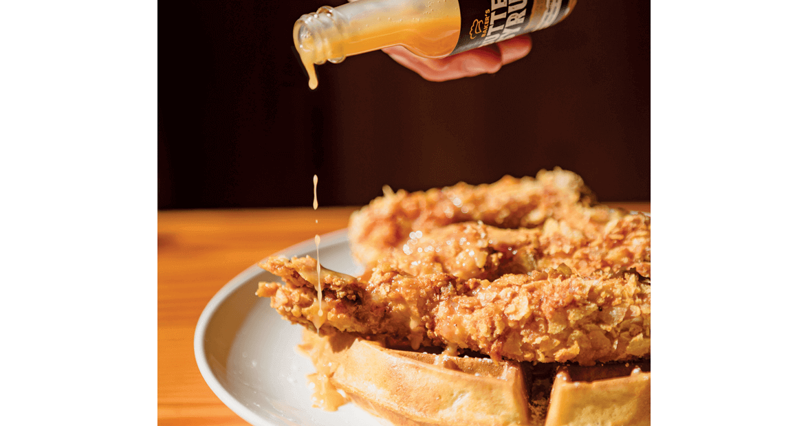 Dip. Dunk. Drizzle. Over and onto fried chicken, hamburgers, and, of course, pancakes, waffles, and anything with a bready texture, the better to absorb the sugary, buttery, palomino-pony-colored “craft syrup” that is Baker’s Kitchen’s signature condiment. “Move over, maple!” reads the label. While the recipe is what the owners politely call “proprietary,” here’s a secret: There’s not a drop of maple syrup in the potion.