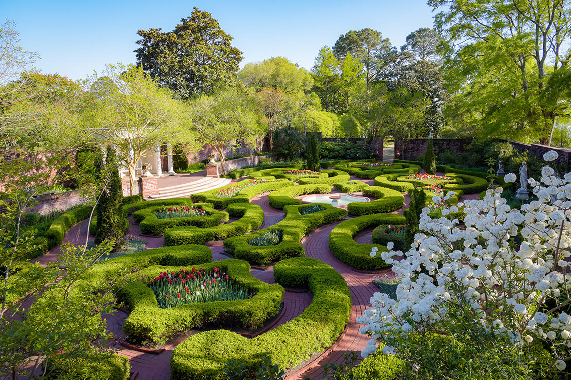 Tryon’s Latham Garden is a formal garden of flowers, pathways, and clipped hedges that were commonly used in English gardens of the period. Photography courtesy of Tryon Palace