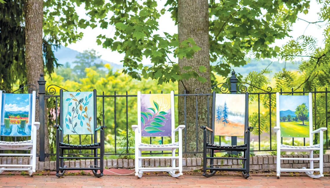 Black Mountain’s one-of-a-kind rocking chairs have lined Cherry and State streets since 2013, helping the town live up to its reputation as “the front porch of western North Carolina.” Local artists and businesses paint and sponsor the chairs, which are auctioned off at the end of each year as a fund-raiser for the “town that rocks.”