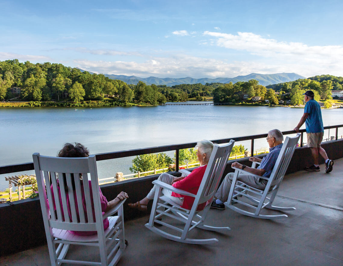 Debbie Robison (left) and Jo and Charlie Mallette gaze out onto Lake Junaluska from The Terrace hotel. Lucky guests might see the area’s five resident eagles swooping down to catch fish. photograph by Tim Robison