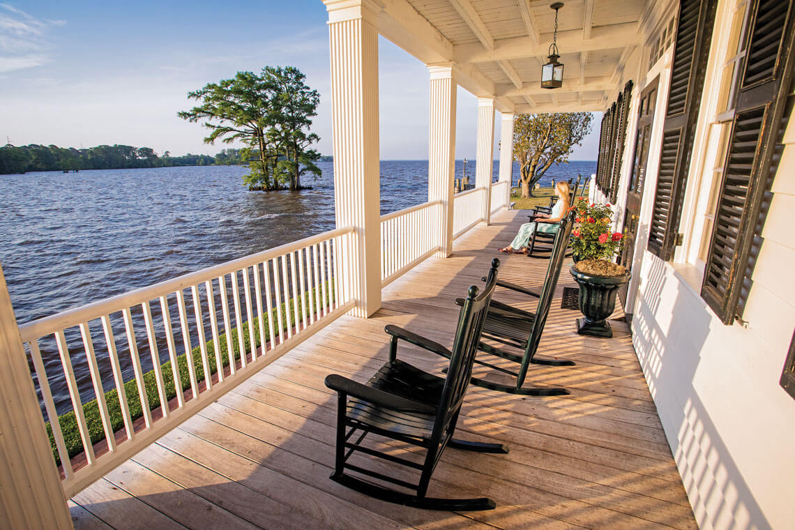 The rocking chairs on the porches of the 1782 Penelope Barker House look black, but when the sunlight hits just so, a greenish tint shimmers off their wooden frames. The paint has historic roots, says Mike Ervin, former executive director of the house museum: After the Civil War, the federal government sent black paint to Southern properties to help repair damage from nearby battles. Many people mixed in light green or blue paint in an effort to stand out. Today, visitors rock between past and present before a stunning view of Edenton Bay.