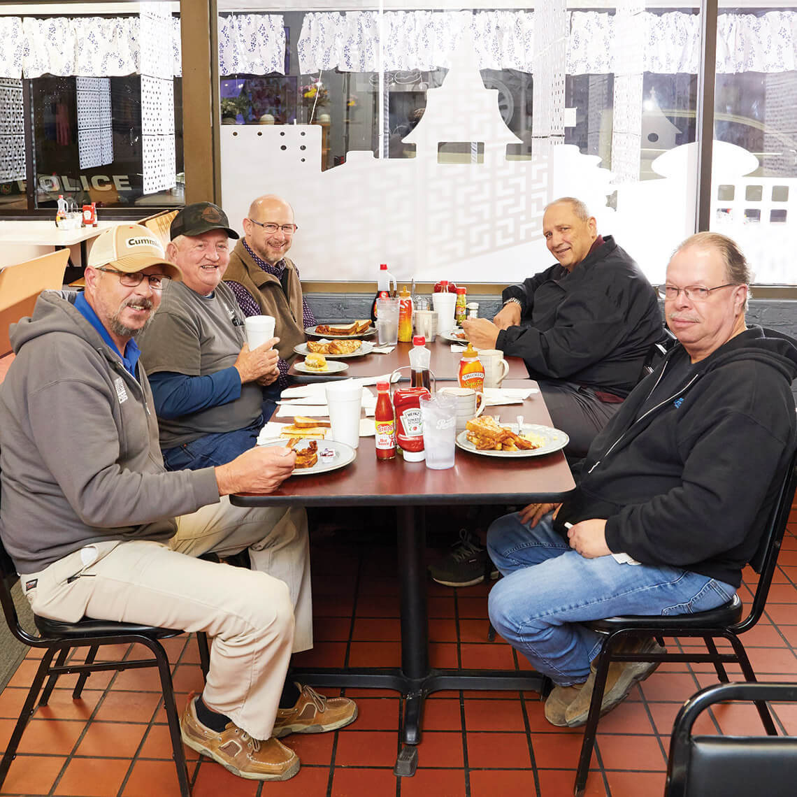 David McAnelly (back right) and some members of the “five guys” group visit The Country Biscuit every day that the restaurant is open to chat over breakfast plates that often include a buttermilk biscuit. photograph by Chris Rogers