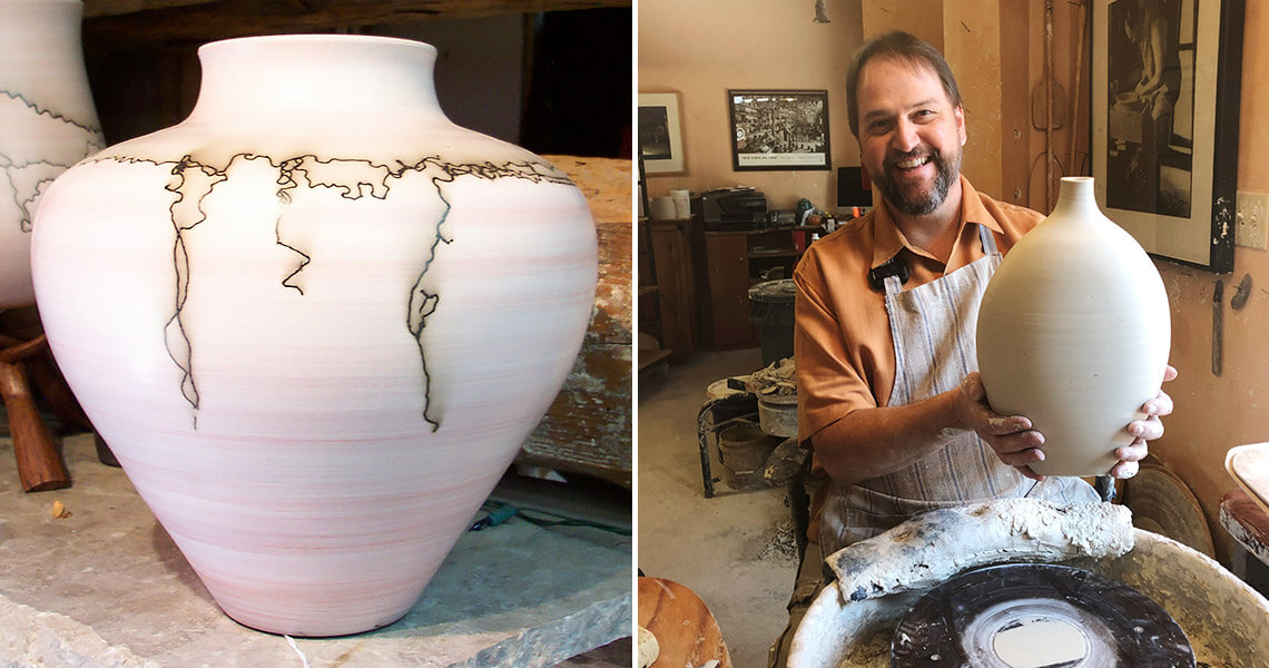 Walk into the 116-year-old house that holds Johnston & Gentithes Studios and you might find Johnston at the potter’s wheel, pulling clay into the curves of a vase as you wander the showroom admiring his designs. In one corner, you might see a woodfired jar with a bird playfully peeking out; in another, animal sculptures by his wife, Carol Gentithes, like a serene, reclined sloth. This display area opens into the makers’ workspaces. “You get to see the intricacies, the ins and outs of the studio,” Johnston says.