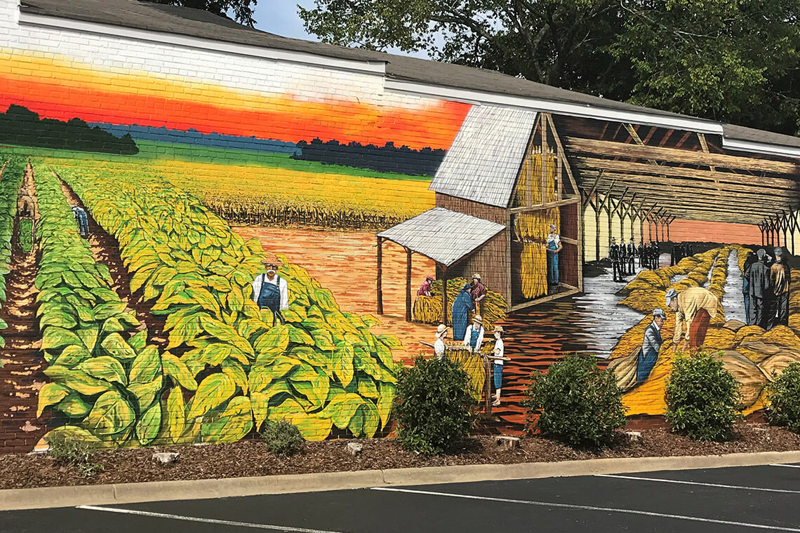 The When Tobacco Was King mural is located on the side of the Luke Marion building in downtown Carthage. Photography courtesy of Visit Pinehurst, Southern Pines, Aberdeen
