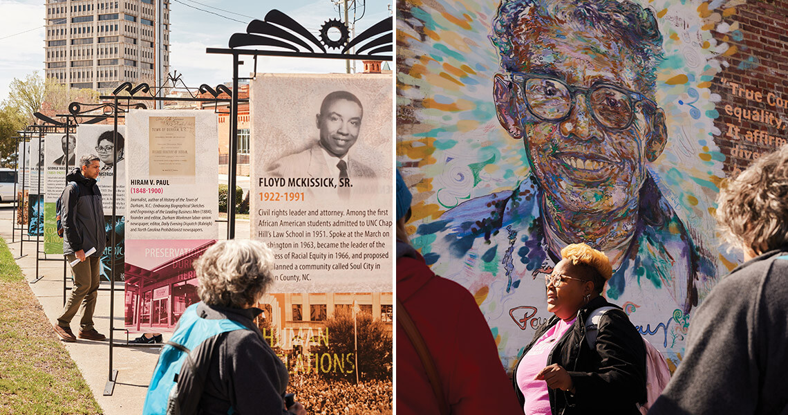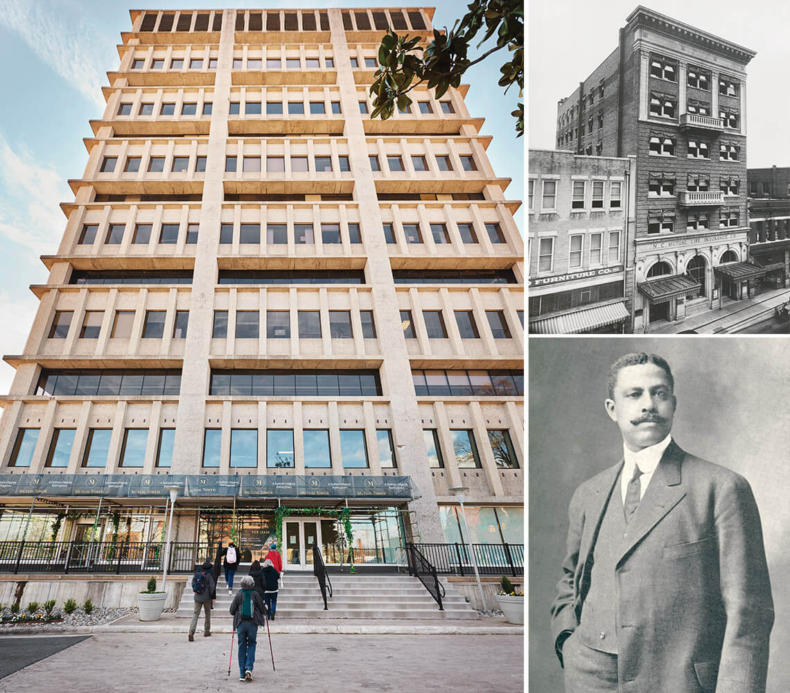 NC Mutual Life Insurance was founded by John Merrick in 1898. photograph by ALEX BOERNER; “NC MUTUAL HOME OFFICE AND MECHANICS AND FARMERS BANK,” DAVID M. RUBENSTEIN RARE BOOK & MANUSCRIPT LIBRARY, DUKE UNIVERSITY; PORTRAIT FROM JOHN MERRICK: A BIOGRAPHICAL SKETCH BY R. MCCANTS ANDREWS (PRESS OF THE SEEMAN PRINTERY, DURHAM, NC, 1920), COURTESY OF DOCUMENTING THE AMERICAN SOUTH, UNC CHAPEL HILL LIBRARY