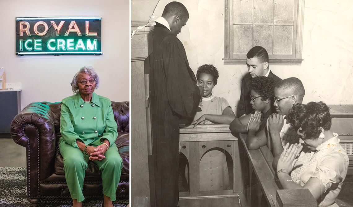 As a member of the “Royal Seven” (right), Virginia Williams (left) participated in an early sit-in at the Royal Ice Cream Parlor in 1957. photograph by DISCOVER DURHAM; “THE ROYAL ICE CREAM STRIKERS PRAYING,” NCC_0040_0126, DURHAM CIVIL RIGHTS HERITAGE PROJECT COLLECTION (NCC.0040). NORTH CAROLINA COLLECTION, DURHAM COUNTY LIBRARY, NC