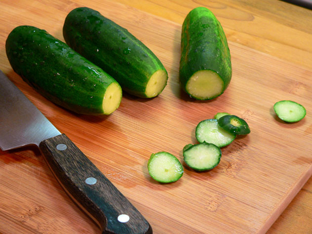 Cut about 1/4 inch off of each end of the cucumbers. Discard the end pieces.