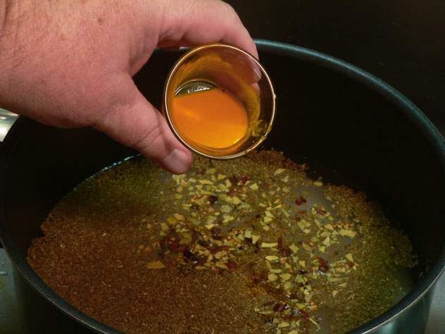 Add the turmeric. You’ll also find recipes that call for various amounts of turmeric. It is a great spice with lots of health benefits for you. It also has a very strong color that can stain anything it comes in contact with; so be careful with it. I find using a smaller amount is best for me. It doesn’t change the color of the completed pickle as much as adding more of it will. Here, I’ve added just a bit of water to my Turmeric to be sure it will dissolve well enough.