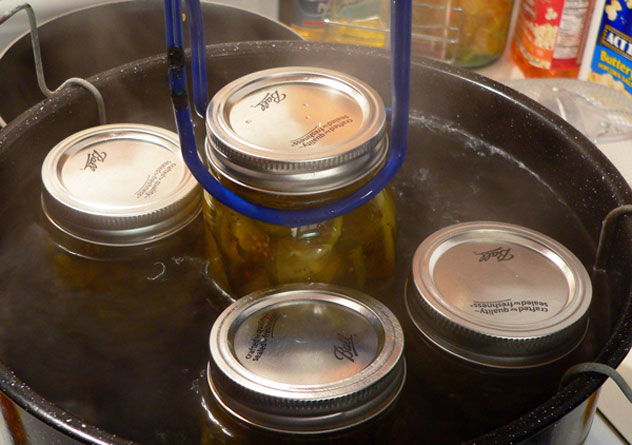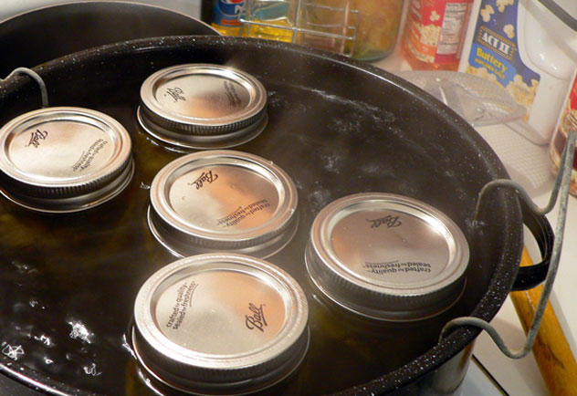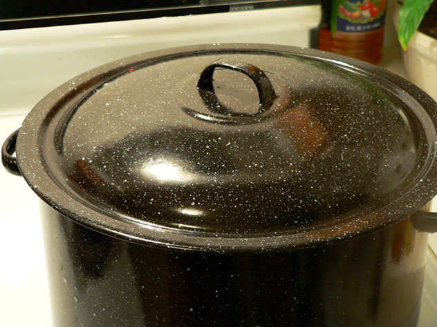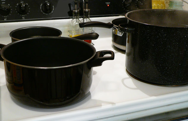 I use four pots. The pot on the front left is usually the food item. The big pot on the front right is my canning pot. I keep a small pot on the back left burner that holds my lids and bands. The larger pot on the back right burner is just more water that I keep heated during the process.