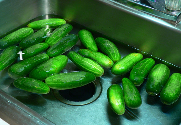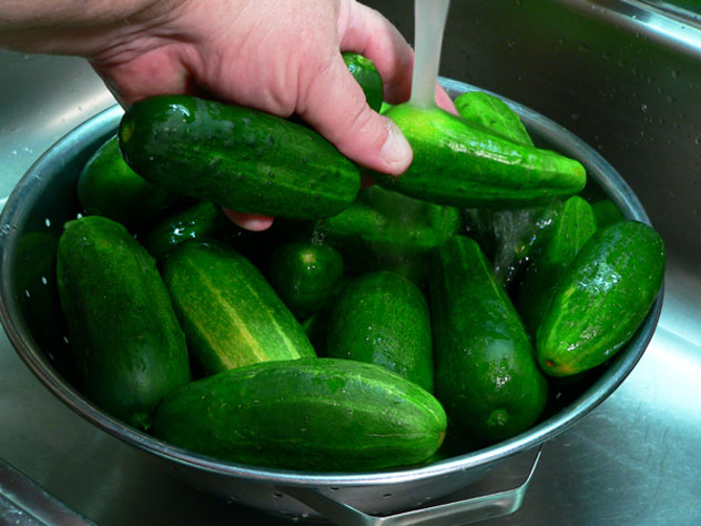 Place the cucumbers in a sink filled with cold water. Gently rub each cucumber by hand to remove any dirt or other particles. Do not use a vegetable brush to scrub the cucumbers. Drain off the dirty water when finished.