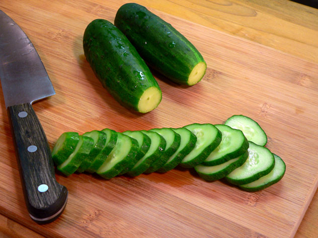 Slice each cucumber into 1/4 inch thick slices.