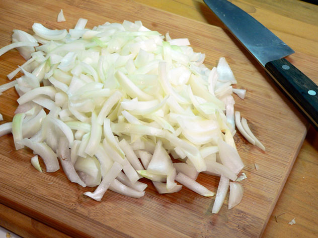 Next, slice up the onions. Just looking at this picture makes my eyes water. How about you?