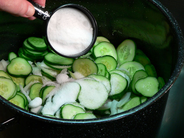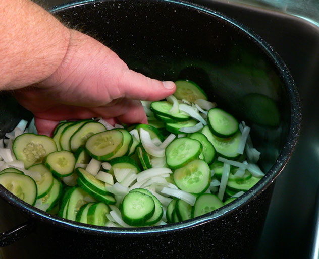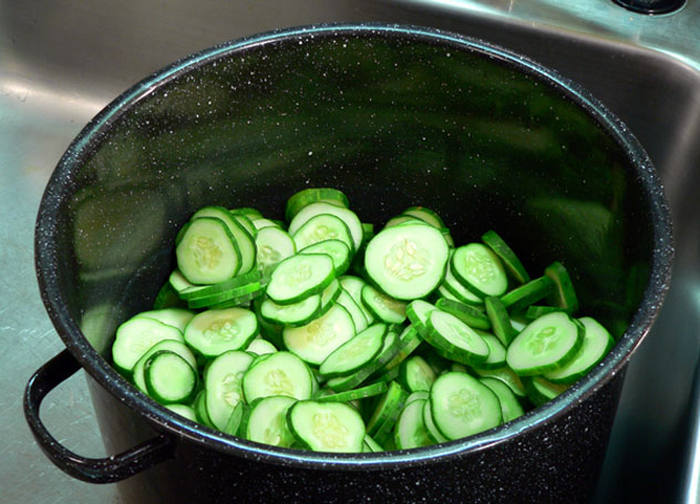 Place the sliced cucumbers in a large pot. I use my enameled canning pot for this part. Just don’t use aluminum. Stainless steel or teflon coated will work well.