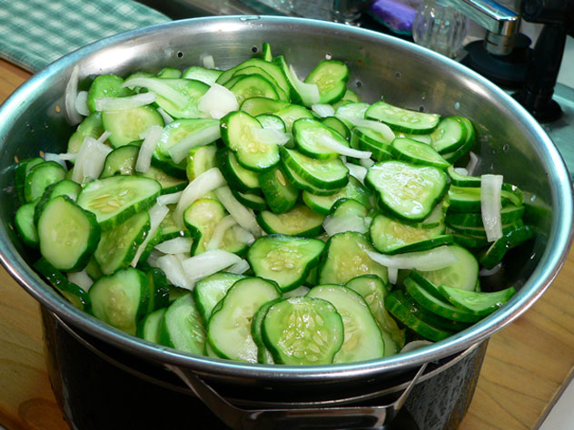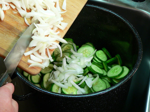 With the jars starting to boil, take the cucumbers and onions mixture out of the refrigerator and drain off the salt water.