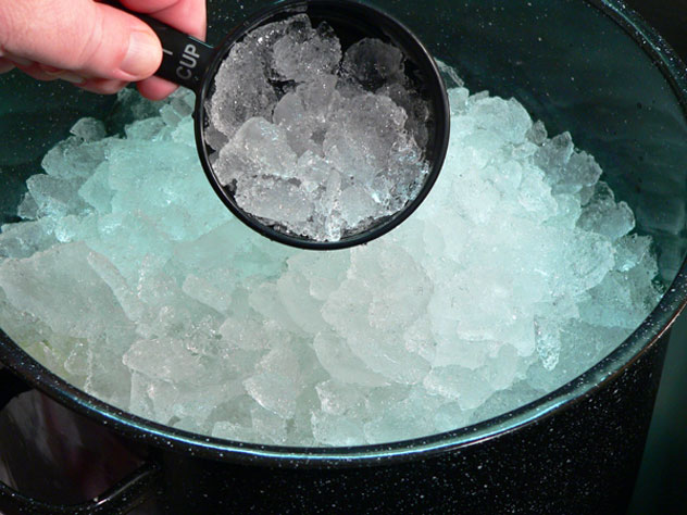 Cover the top with about two inches of crushed ice or cubed ice. If possible, place this pot in your refrigerator for 3 to 4 hours or even overnight. If you don’t have room in the refrigerator for it, just keep adding more ice as it melts. It’s very important to keep the cucumbers and onions cold.