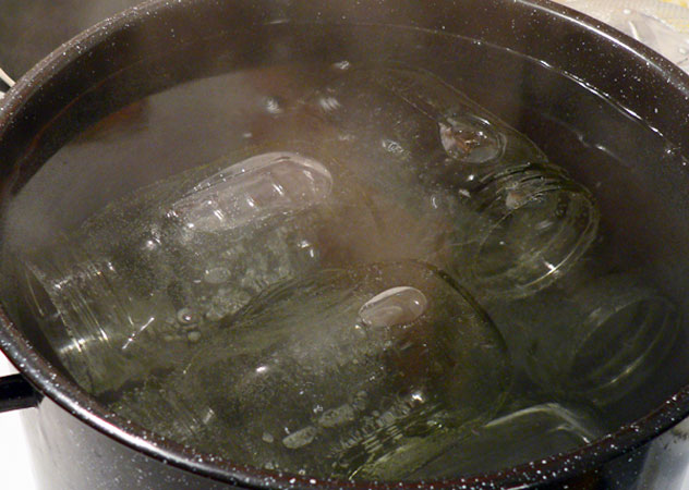 Once the jars are lowered into the canning pot, they should be covered with an inch or two of water. Again, consult the recipe you are using for the proper amount. I use the same water that was in the pot from sterilizing the jars. They’re filled and closed so it will not matter. I’ve also used that extra pot of water on the back burner to make sure I have enough water over the tops of the jars.