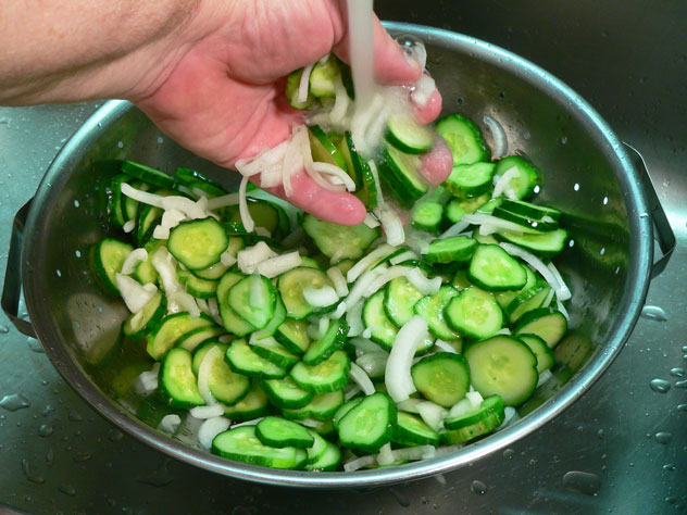 Gently rinse the cucumbers again, under cool running water. Place in a colander and let drain.