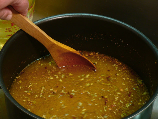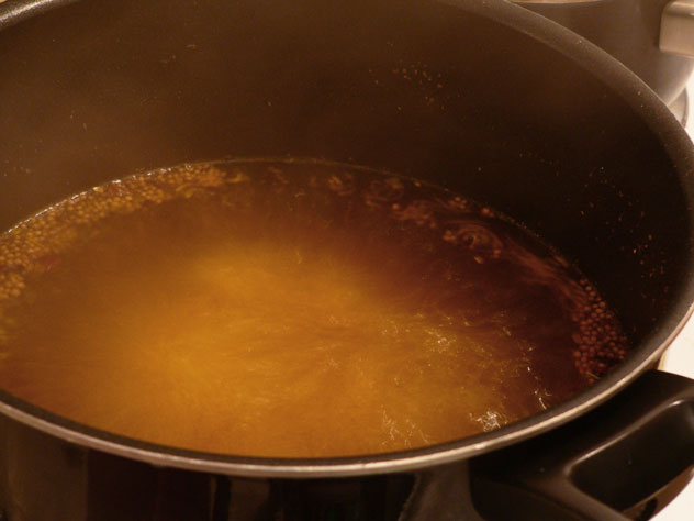 Stir the sugar and spices well. Place over Medium-High heat on your stove top and bring this mixture to a light rolling boil. You should stir it as it starts warming to make certain the sugar has fully dissolved. Don’t let the sugar sit in the bottom of the pot during this process. Keep it moving so it doesn’t scorch or burn.